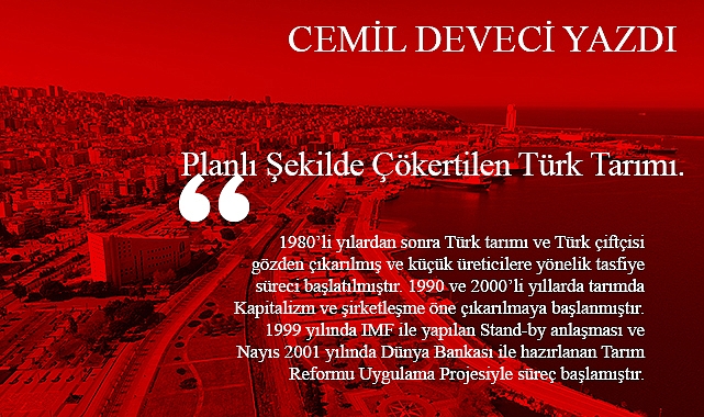 1980’li yılardan sonra Türk tarımı ve Türk çiftçisi gözden çıkarılmış ve küçük üreticilere yönelik tasfiye süreci başlatılmıştır. 1990 ve 2000’li yıllarda tarımda Kapitalizm ve şirketleşme öne çıkarılmaya başlanmıştır. 1999 yılında IMF ile yapılan Stand-by anlaşması ve Nayıs 2001 yılında Dünya Bankası ile hazırlanan Tarım Reformu Uygulama Projesiyle süreç başlamıştır. Ardından Güçlü Ekonomiye Geçiş Proğramı ve AB üyelik sürecinde Ortak Tarım Politikasına uyum çabaları tarımda Kapitalist üretim ilişkilerinin mekanizmaları ve şirketleşmenin temelleri oluşturulmuştur.