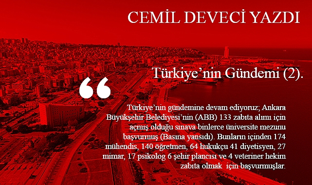 Türkiye’nin gündemine devam ediyoruz; Ankara Büyükşehir Belediyesi’nin (ABB) 133 zabıta alımı için açmış olduğu sınava binlerce üniversite mezunu başvurmuş (Basına yansıdı). Bunların içinden 174 mühendis, 140 öğretmen, 64 hukukçu 41 diyetisyen, 27 mimar, 17 psikolog 6 şehir plancısı ve 4 veteriner hekim zabıta olmak için başvurmuşlar.