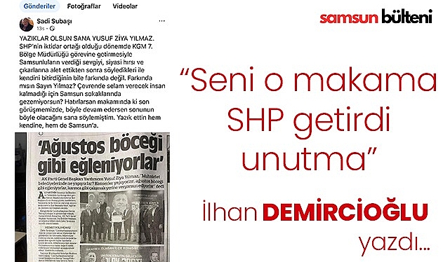 Sadi Subaşı Sosyal Medya hesabından yaptığı açıklamada şunları söykledi ‘ Sosyal Demokrat Halkçı Parti’nin iktidar ortağı olduğu dönemde Karayolları 7. Bölge Müdürlüğü görevine getirmesiyle Samsunluların verdiği sevgiyi, siyasi hırsı ve çıkarlarına alet ettikten sonra söyledikleri ile kendini bitirdiğinin bile farkında değil.